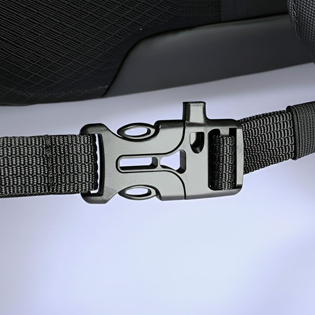 胸部で固定して荷重を分散、肩への負担と揺れを軽減します。