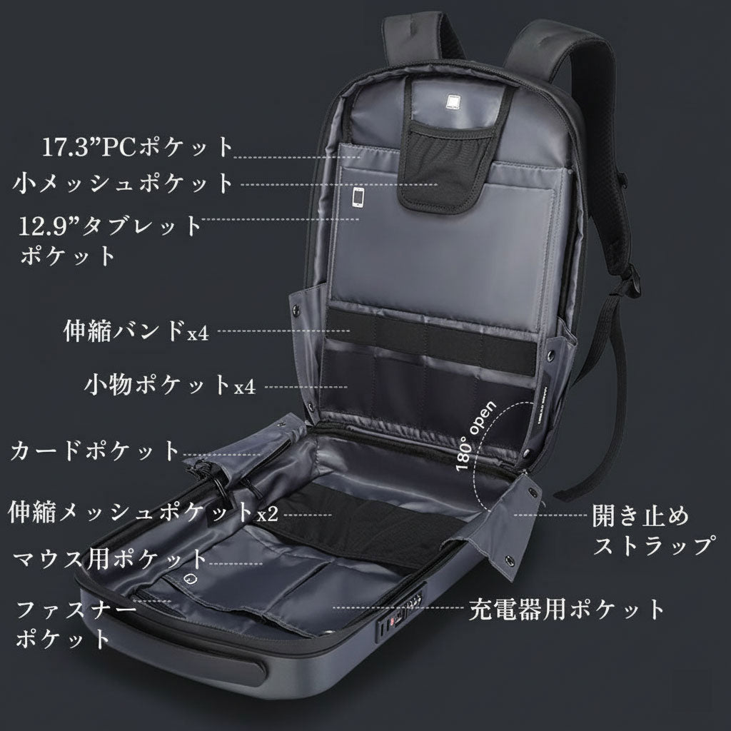 構造:メイン収納スペース×1(17.3”PCポケット×1 + 小メッシュポケット×1+12.9”タブレットポケットx1+伸縮バンドx4+小物ポケット x4+伸縮メッシュポケットx2+マウス用ポケットx1+ファスナーポケットx1+充電器用ポケットx1)、背面ファスナーポケットx1