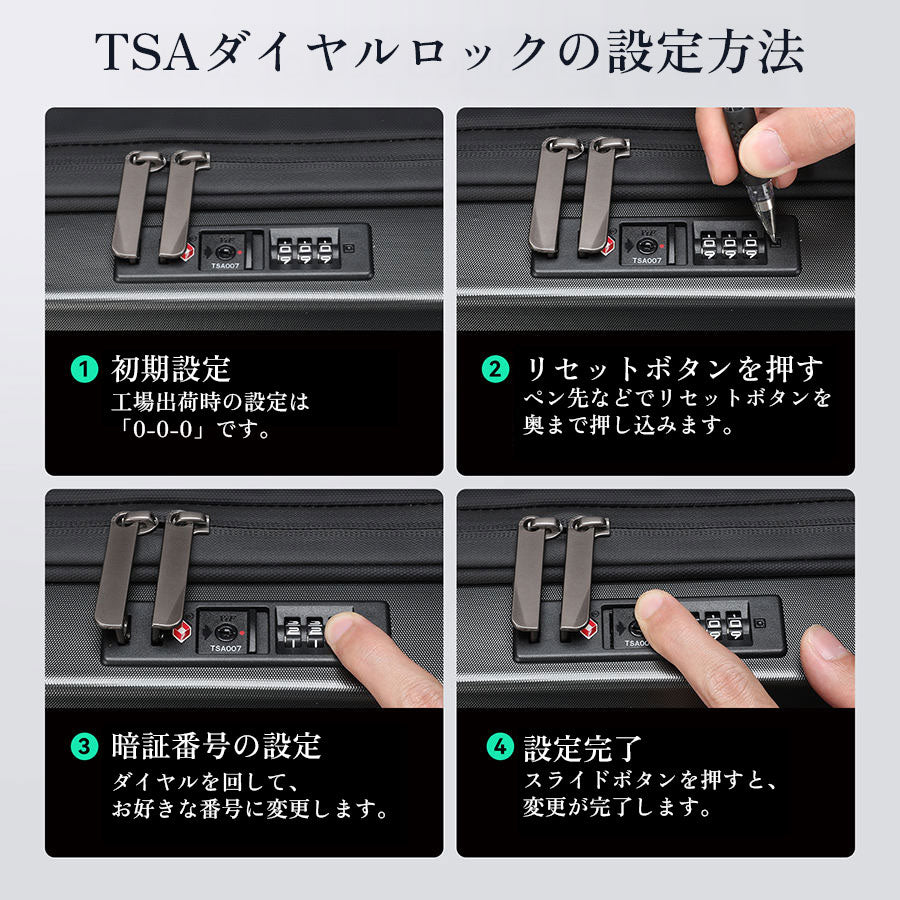 本製品はダイヤル式のTSAロックを採用しているため、鍵(物理キー)は付属しておりません。初期設定の「0-0-0」で解錠し、こちらの手順に従ってお好きな番号を設定してください。鍵穴は空港職員が検査で使用するものです。