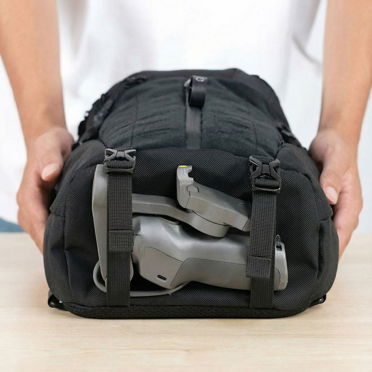 三脚や脱いだ上着などを外側に固定でき、メイン収納を圧迫することなく持ち運べます。