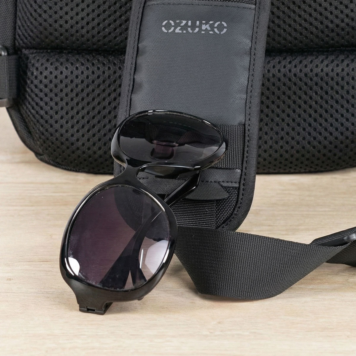置き場に困るサングラスやメガネを、ストラップにサッと掛けてスマートに携帯できます。