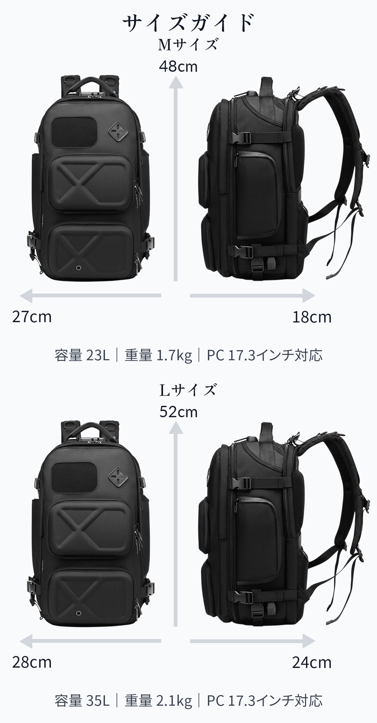 Mサイズ: 48×27×18cm・23L・1.7kg|17"PC対応Lサイズ: 52×28×24cm・35L・2.1kg|17"PC対応