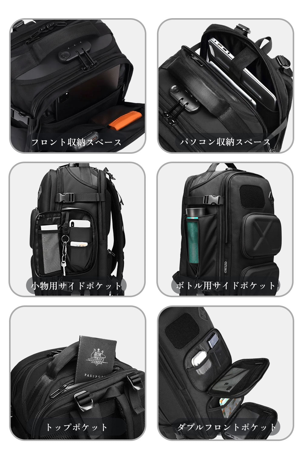 機能:USB充電ポート(防水キャップ付)、スーツケース固定ベルト、キーリング、カードポケット