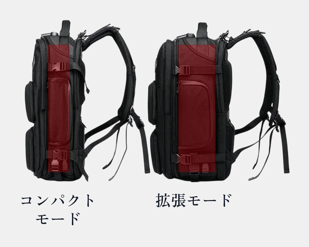 サイドストラップを締めれば通勤向きのコンパクトなシルエットに、緩めれば出張や旅行用の大容量モードに。