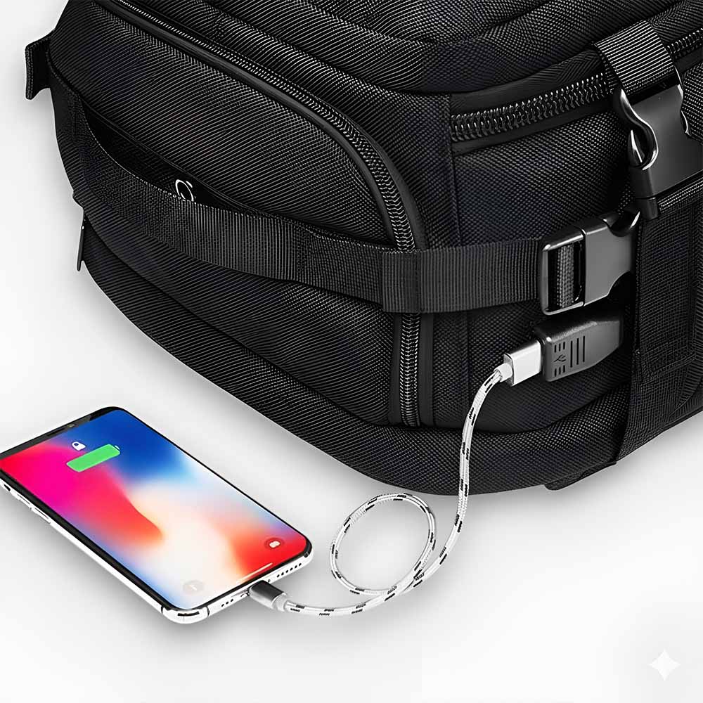 電池切れの不安を解消。移動中も内部バッテリーに接続して、外部ポートからスマホをサッと充電。