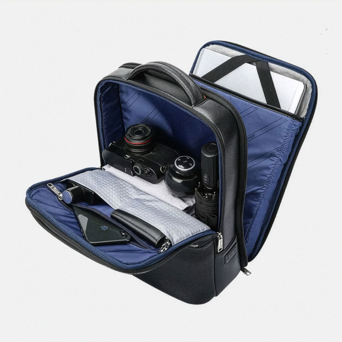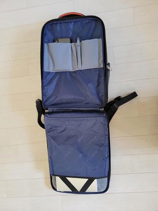 メイン+デジタルの2層構造。180°オープンでA4資料や着替えも整然、朝の支度と移動を時短。