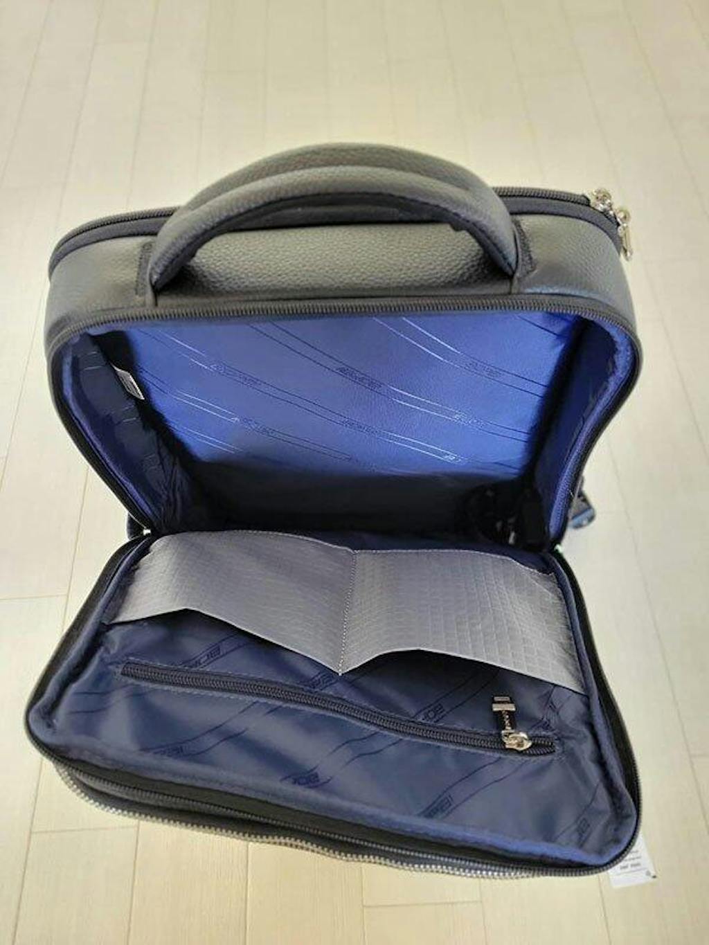 底面と側板にしっかりした芯材を入れており自立しやすい設計です(荷重バランス・床面により例外あり)。満員電車でもシルエットをキープしやすい硬めの箱型で、スーツに馴染む見た目を保ちます。