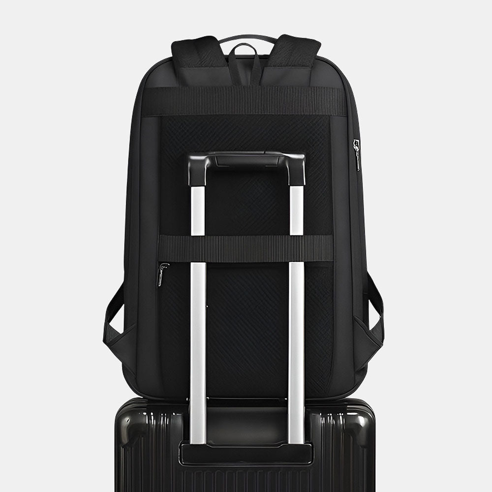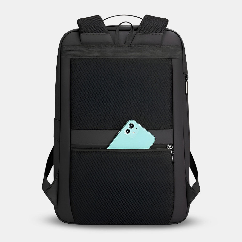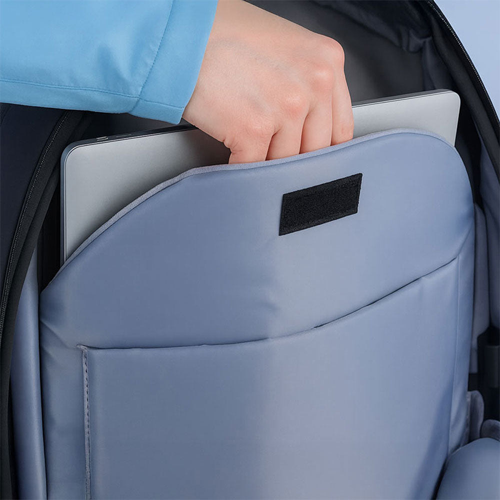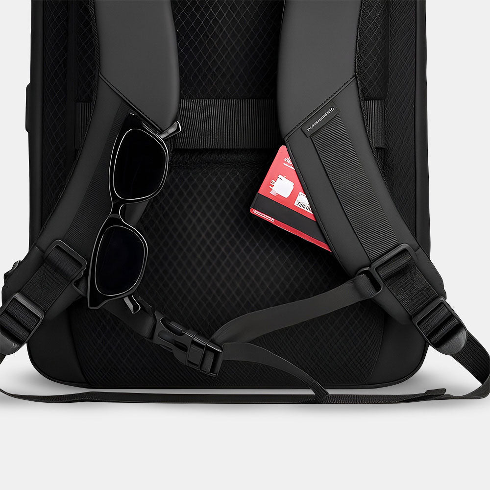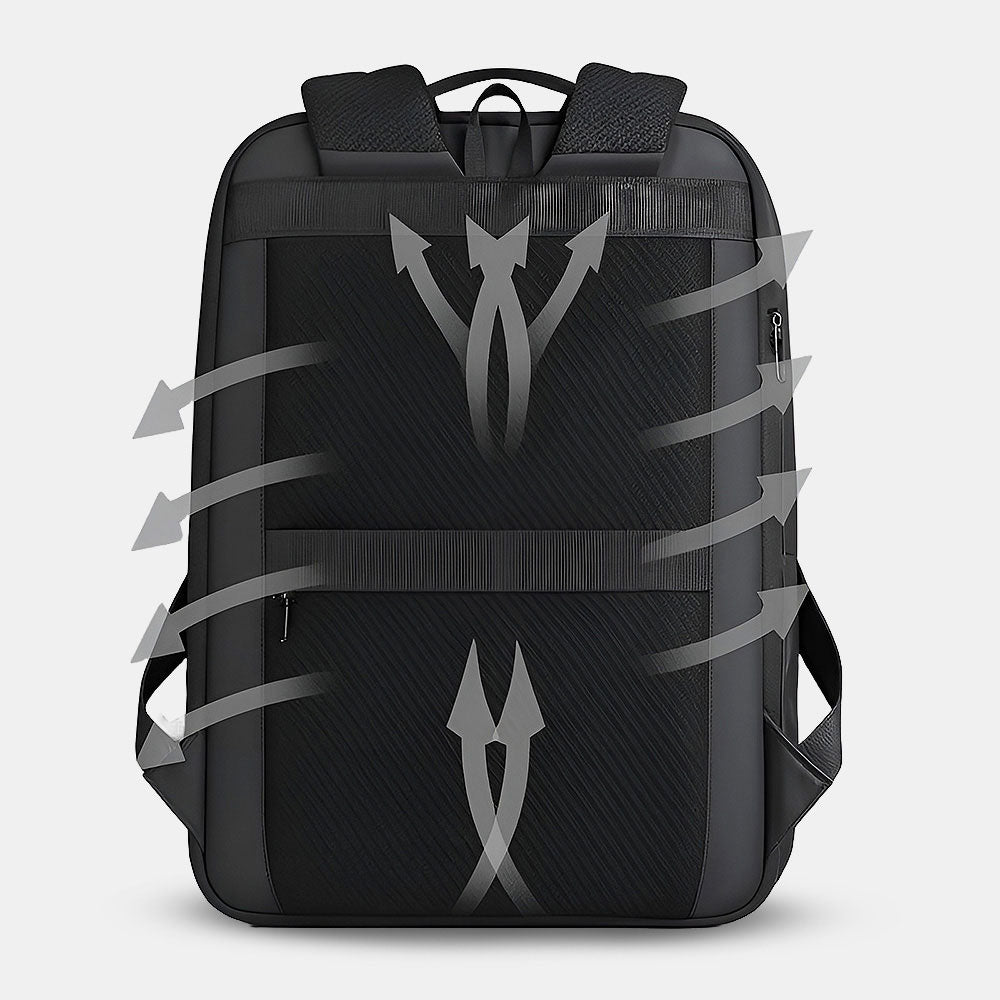 具体的には、背中全面に厚手のメッシュクッション、幅広ショルダーベルト、さらにチェストベルトで荷重を分散する構造になっているため、肩に一点で負担がかかりにくく、歩行時のブレも抑えられます。もちろん入れる荷物量や体格によって感じ方は異なりますが、16インチPC+書類+ガジェット類+日常荷物くらいであれば、長めの通勤や乗り継ぎの多い移動でも快適に背負っていただける想定です。