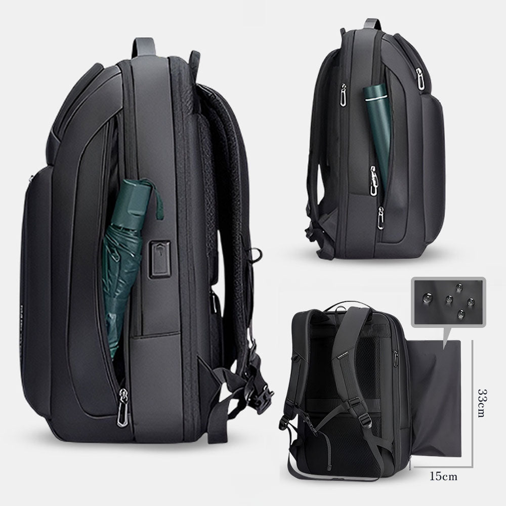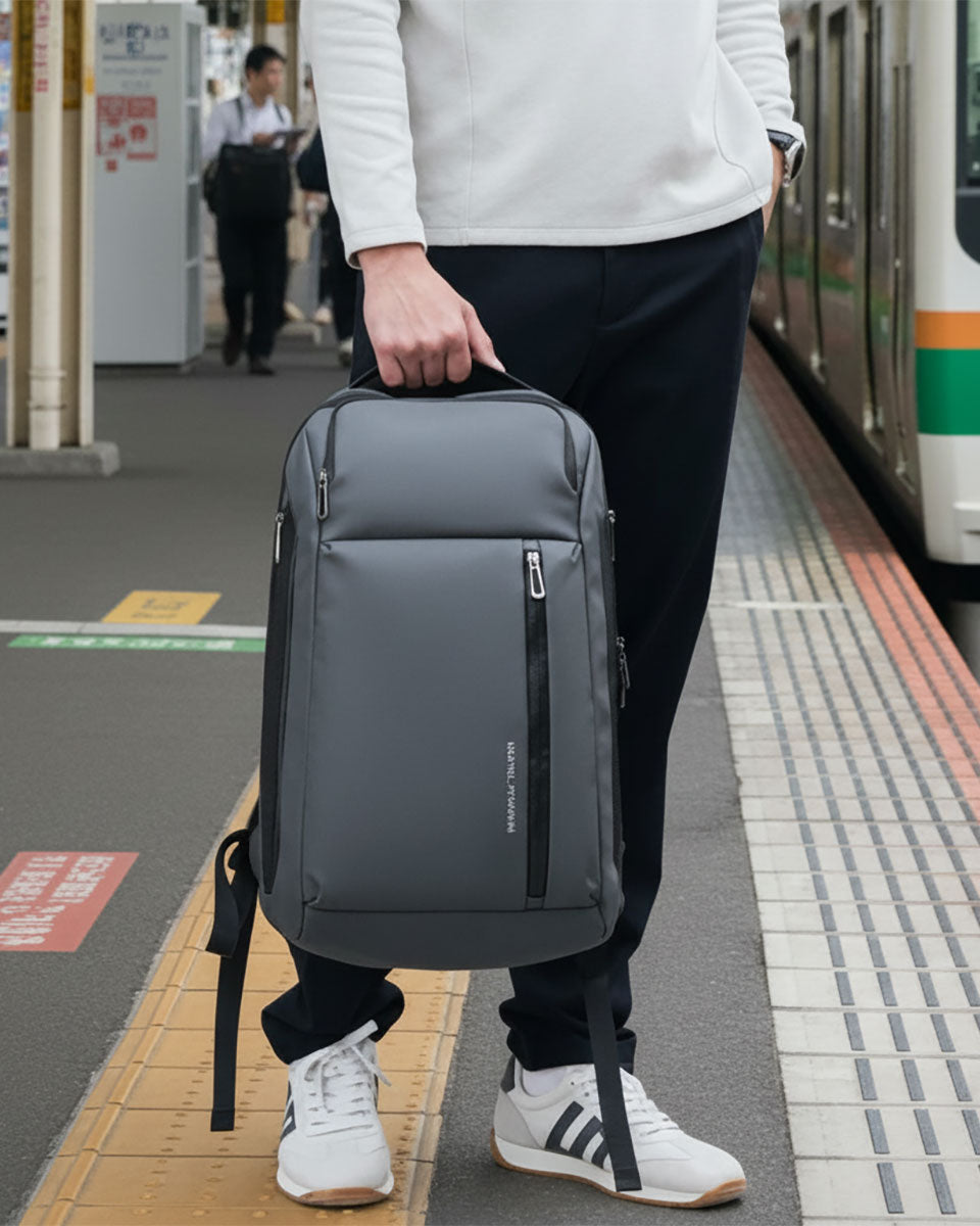 一日の通勤であれば、拡張せず25Lの状態でも、16インチノートPC+充電器、A4書類やノート数冊、長財布・ペンケース、500mlボトル、折りたたみ傘、モバイルバッテリーやポーチ類など、ビジネスの必需品一式が余裕をもって入る想定です。前面ポケットや内装オーガナイザーで、小物も整理しながら持ち運べます。