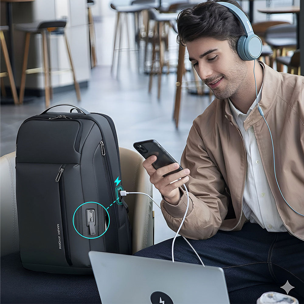 電池切れの不安を解消。移動中も内部バッテリーに接続して、外部ポートからスマホをサッと充電。