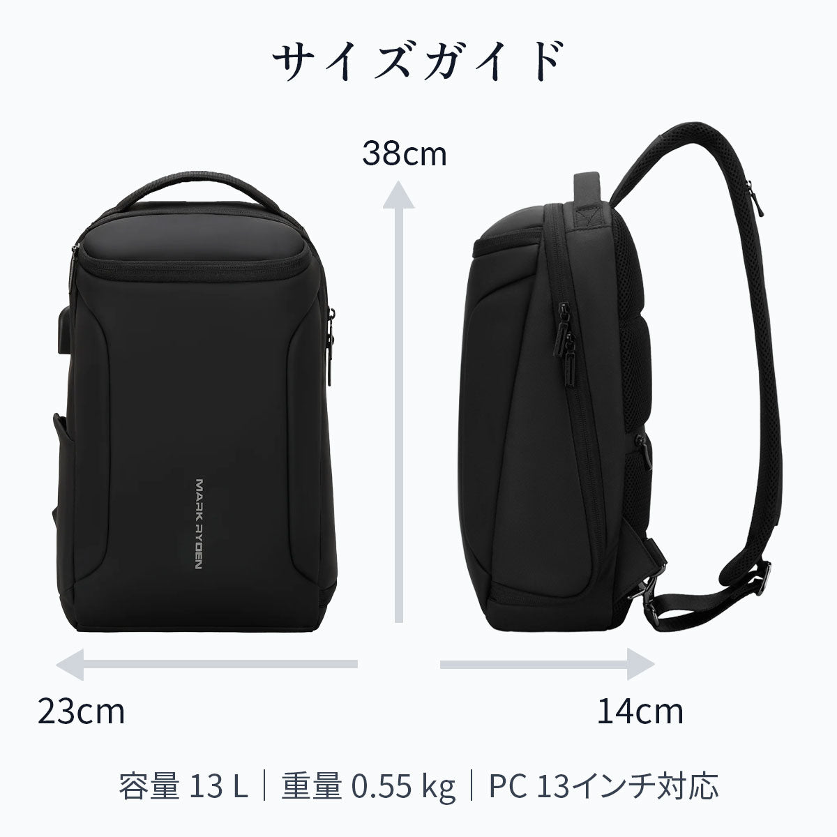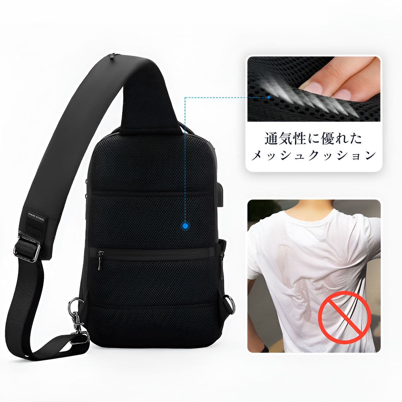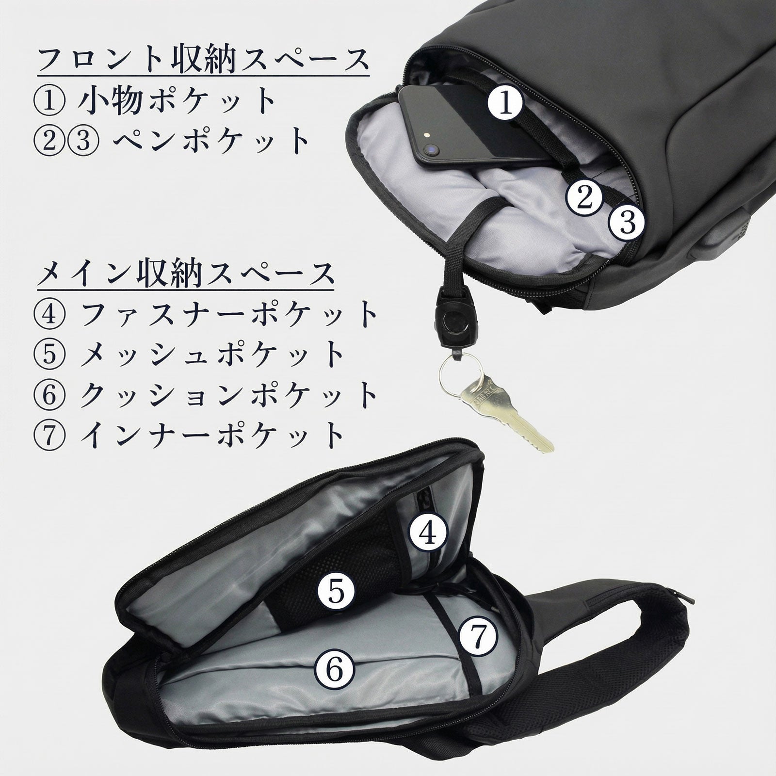 機能:カードポケット、左右付け替えショルダーストラップ、USB充電ポート