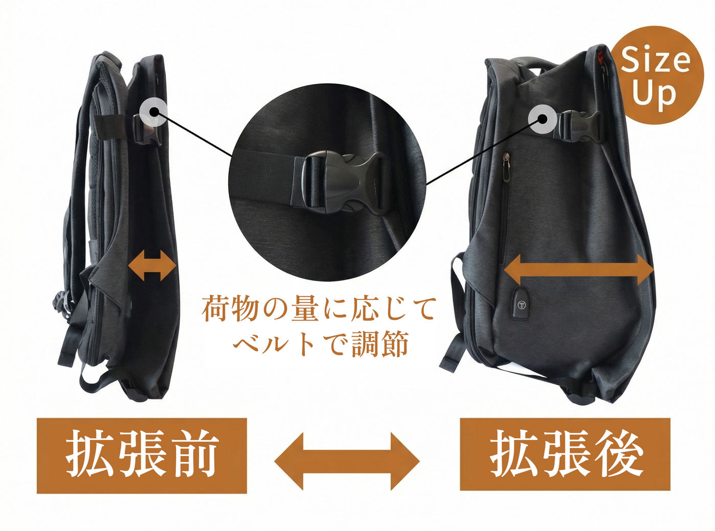 荷物の量に合わせて、厚みを自在にコントロール。少ない日は薄くスマートに、多い日はバックルを緩めて大容量に使えます。