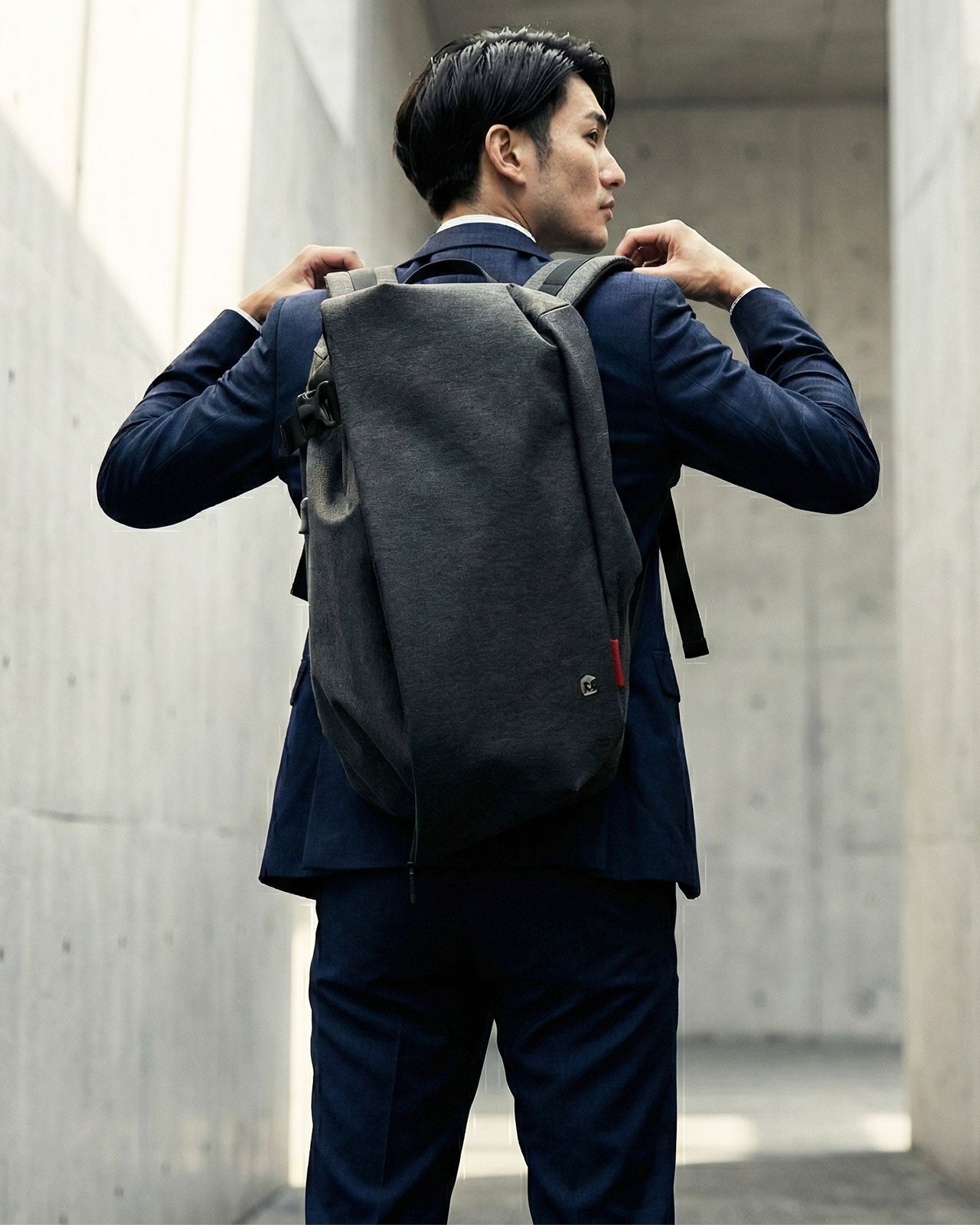 ありきたりなバッグとは一線を画すフォルムが、スーツ姿に洗練された個性をプラスします。