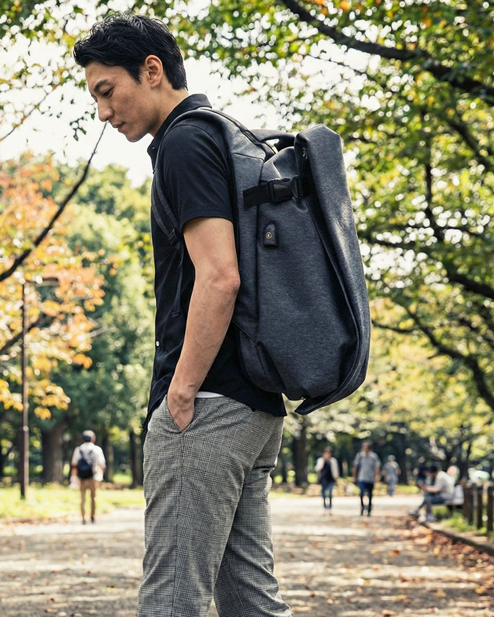 「真四角なビジネスバッグが苦手で、このデザインを選びました。PCやお弁当も余裕で入る収納力に満足です。」— 野口康介