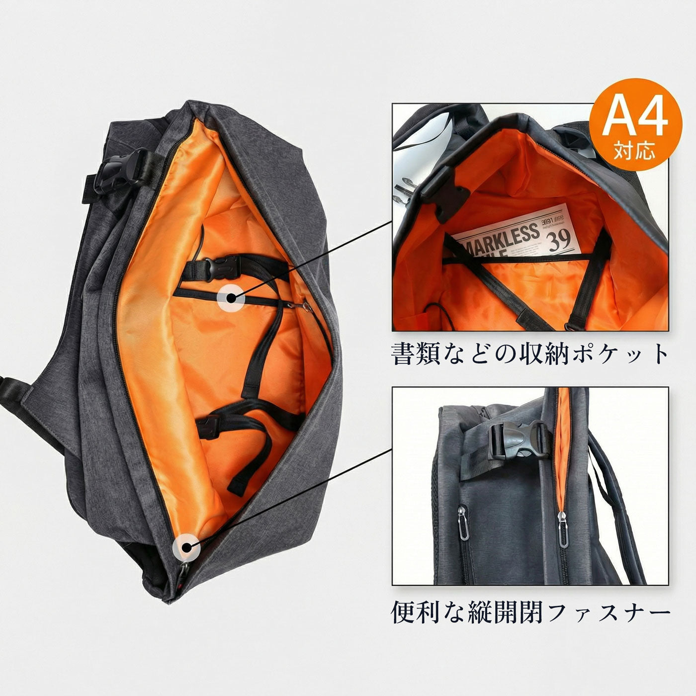 一般的な「上開き」ではなく、縦ファスナーで「横開き」になる構造です。ガバッと開くため中身が見渡しやすく、奥の荷物もスムーズに取り出せます。「慣れると非常に使いやすい」と評判です。