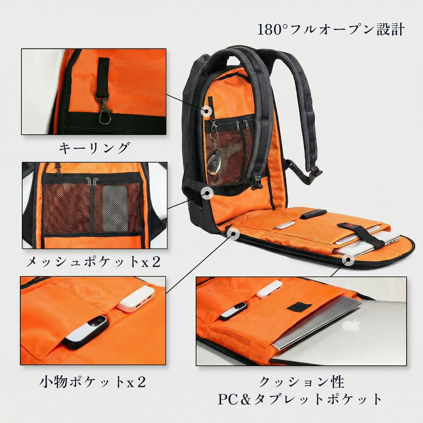 機能:USB充電ポート、キャリーケース固定ベルト、キーリング