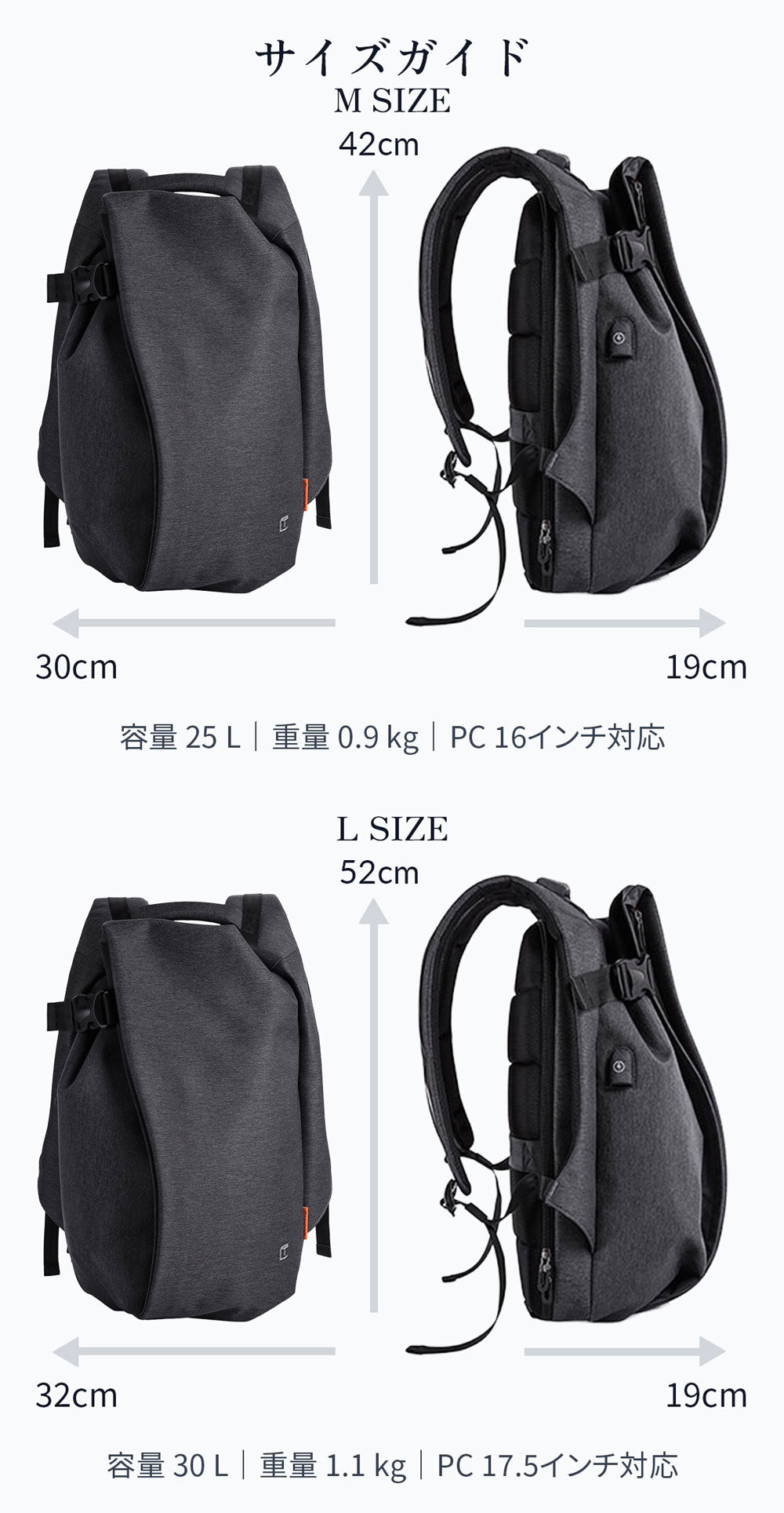 Mサイズ: 42×30×19cm・25L・0.9kg|16"PC対応Lサイズ: 52×32×19cm・30L・1.1kg|17.5"PC対応