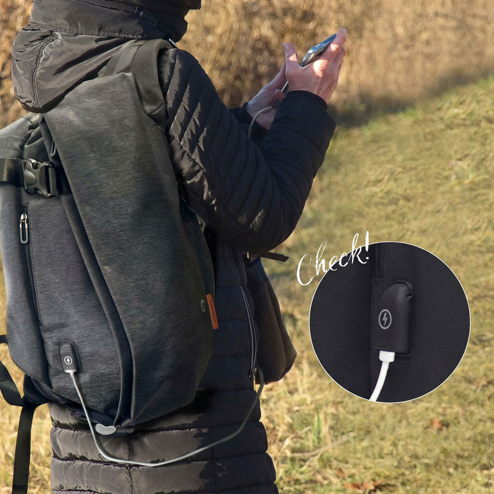 電池切れの不安を解消。移動中も内部バッテリーに接続して、外部ポートからスマホをサッと充電。